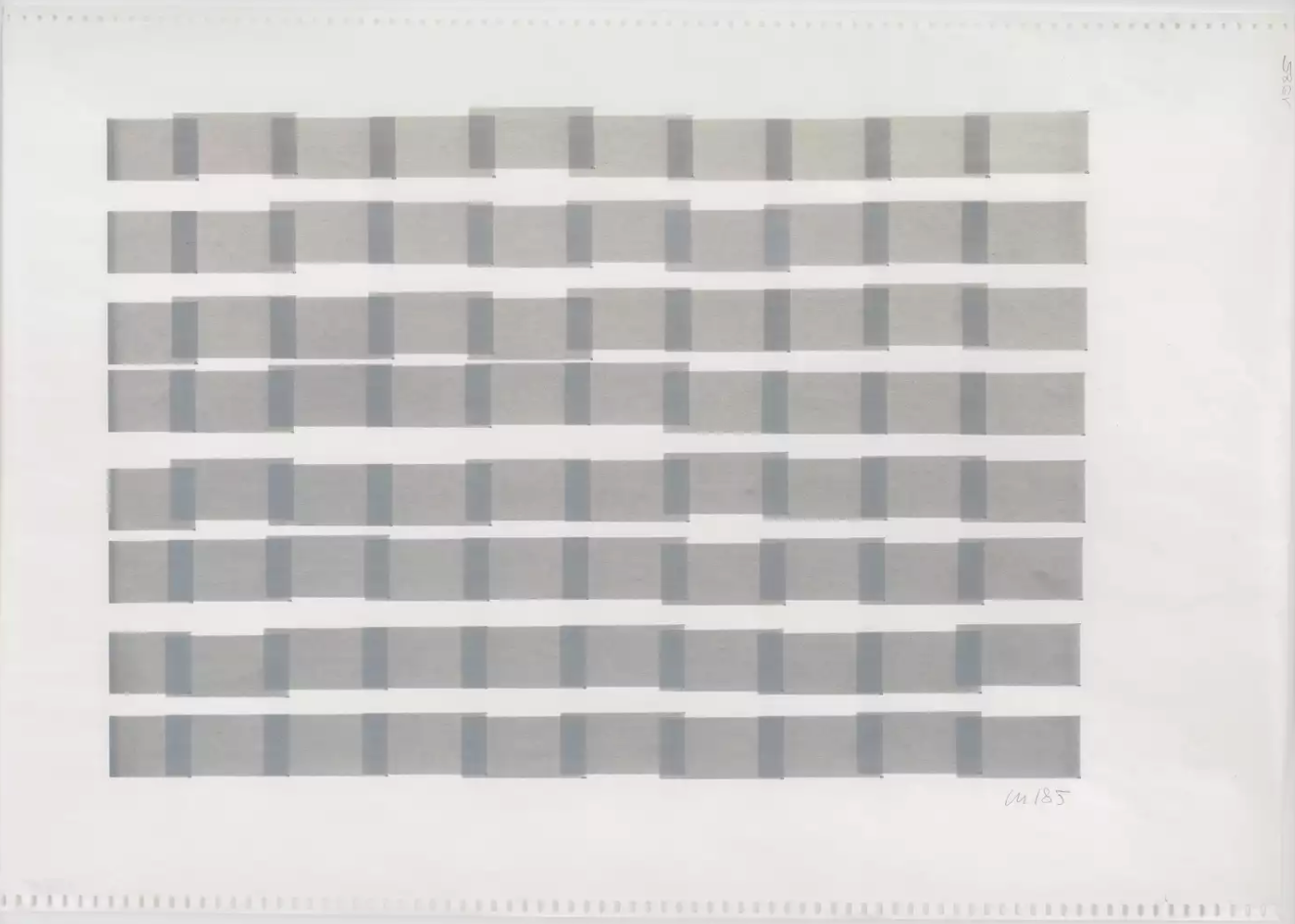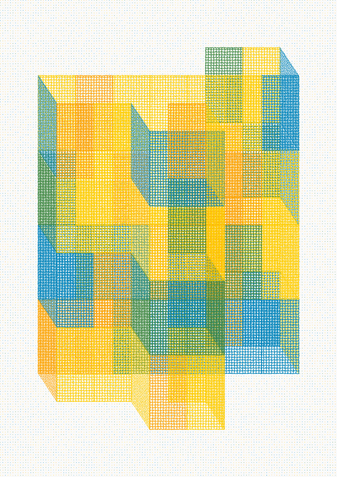 Swahn builds upon the work of these legends due to his expert knowledge of enduring color palettes and his ability to code geometric complexity. Geometry and architecture are central to the collection as he employs rectilinearly plotted dots in a usually self-avoiding random walk to form walls, spaces, and grids with a textile quality. To achieve this, he uses only dots to form lines in a cabinet projection, often repeated vertically or separated into levels. This use of geometric patterning is an ode to the artist’s affinity for patterns in his other modes of artistic expression: architecture, music, and language.